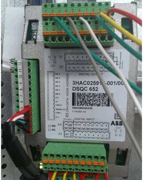 圖所示為 DSQC652通訊板,上下各有兩排端子,包含16個(gè)數(shù)字輸入和16個(gè)數(shù)字輸出,每一個(gè)接口對應(yīng)一個(gè)地址,例如X1.1對應(yīng)數(shù)字輸出0號(hào)地址(do0),X1.2 對用數(shù)字輸出1號(hào)地址(do1),X3.1對應(yīng)數(shù)字輸入0號(hào)地址(di0),X3.2對應(yīng)數(shù)字輸入的1號(hào)地址(di1),依此類推下去。每個(gè)端子排的9接 703 號(hào)線(COM),10接704號(hào)線(+24V)。